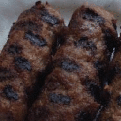 Fleischwurst und Schwarzwurst in feine Streifen, mit Zwiebeln und Gewürzgurken.